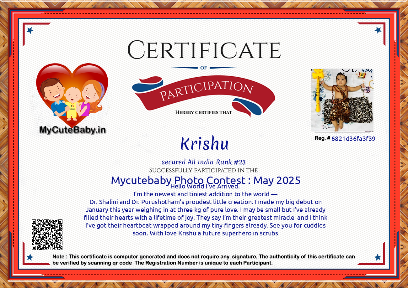 MyCuteBaby is India's most trusted and oldest baby photo contest with best voting securities & transparency system. MyCuteBaby has been organizing monthly contests since February 2017 and has declared 10,600 winners across 106 monthly contests from February 2017 to November 2025 .Enter your baby's photo today for a chance to win and be featured in our gift hamper gallery for the month of December 2025! For detailed prize information, click on the 'Prizes' button to view the prize details of each and every monthly contest.