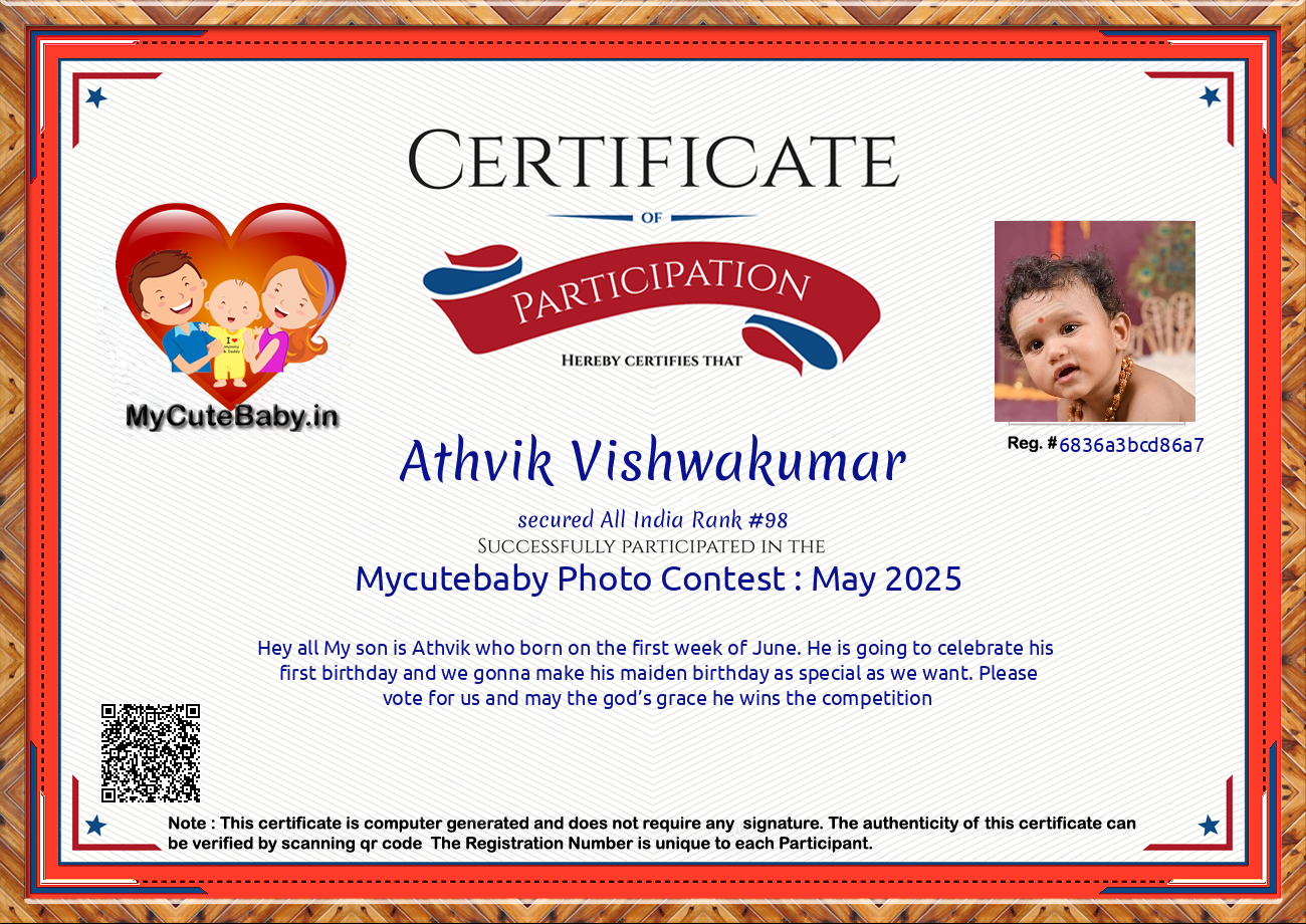 Participation certificate for all the participants whose mycutebaby votes are more than 1000.