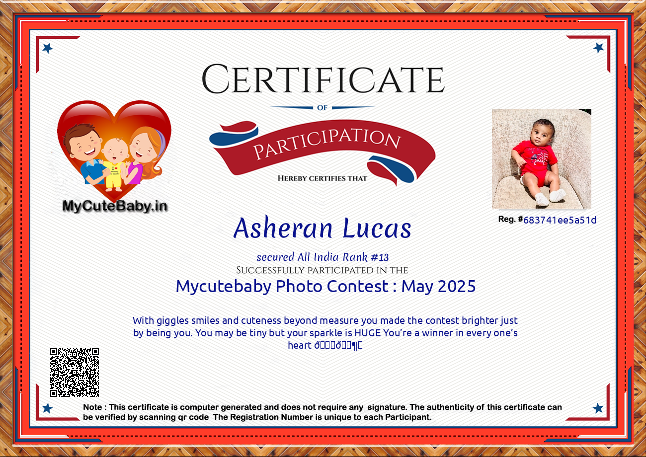 MyCuteBaby is India's most trusted and oldest baby photo contest with best voting securities & transparency system. MyCuteBaby has been organizing monthly contests since February 2017 and has declared 10,600 winners across 106 monthly contests from February 2017 to November 2025 .Enter your baby's photo today for a chance to win and be featured in our gift hamper gallery for the month of December 2025! For detailed prize information, click on the 'Prizes' button to view the prize details of each and every monthly contest.