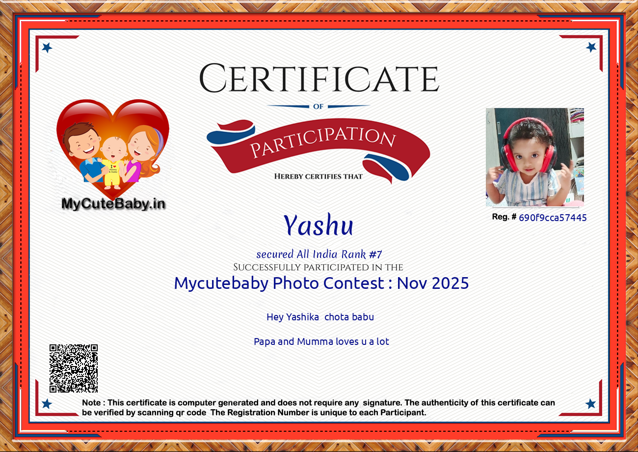 MyCuteBaby is India's most trusted and oldest baby photo contest with best voting securities & transparency system. MyCuteBaby has been organizing monthly contests since February 2017 and has declared 10,600 winners across 106 monthly contests from February 2017 to November 2025 .Enter your baby's photo today for a chance to win and be featured in our gift hamper gallery for the month of December 2025! For detailed prize information, click on the 'Prizes' button to view the prize details of each and every monthly contest.