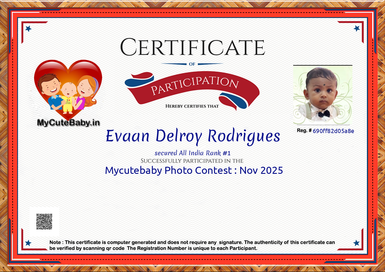 MyCuteBaby is India's most trusted and oldest baby photo contest with best voting securities & transparency system. MyCuteBaby has been organizing monthly contests since February 2017 and has declared 10,600 winners across 106 monthly contests from February 2017 to November 2025 .Enter your baby's photo today for a chance to win and be featured in our gift hamper gallery for the month of December 2025! For detailed prize information, click on the 'Prizes' button to view the prize details of each and every monthly contest.