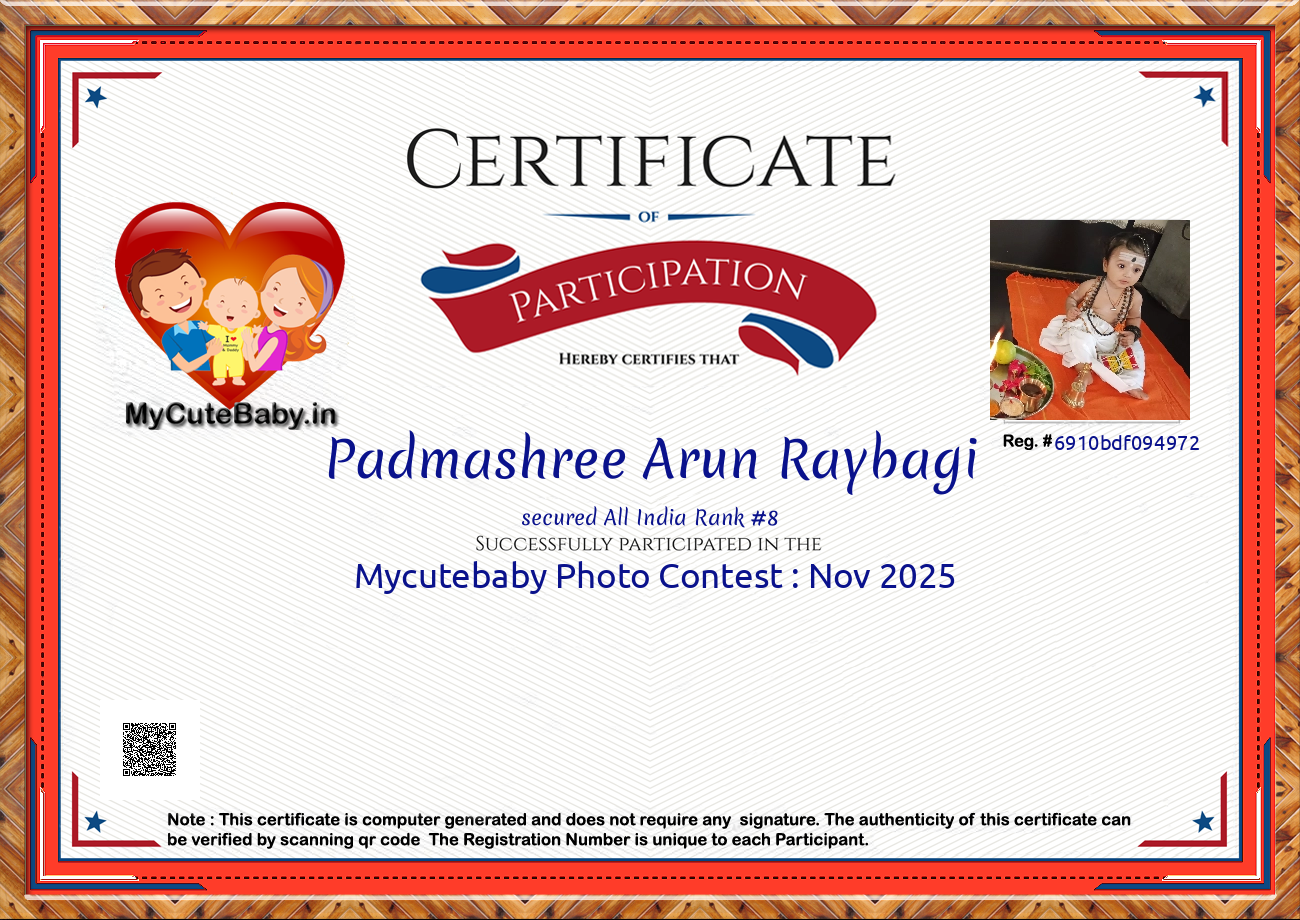MyCuteBaby is India's most trusted and oldest baby photo contest with best voting securities & transparency system. MyCuteBaby has been organizing monthly contests since February 2017 and has declared 10,600 winners across 106 monthly contests from February 2017 to November 2025 .Enter your baby's photo today for a chance to win and be featured in our gift hamper gallery for the month of December 2025! For detailed prize information, click on the 'Prizes' button to view the prize details of each and every monthly contest.
