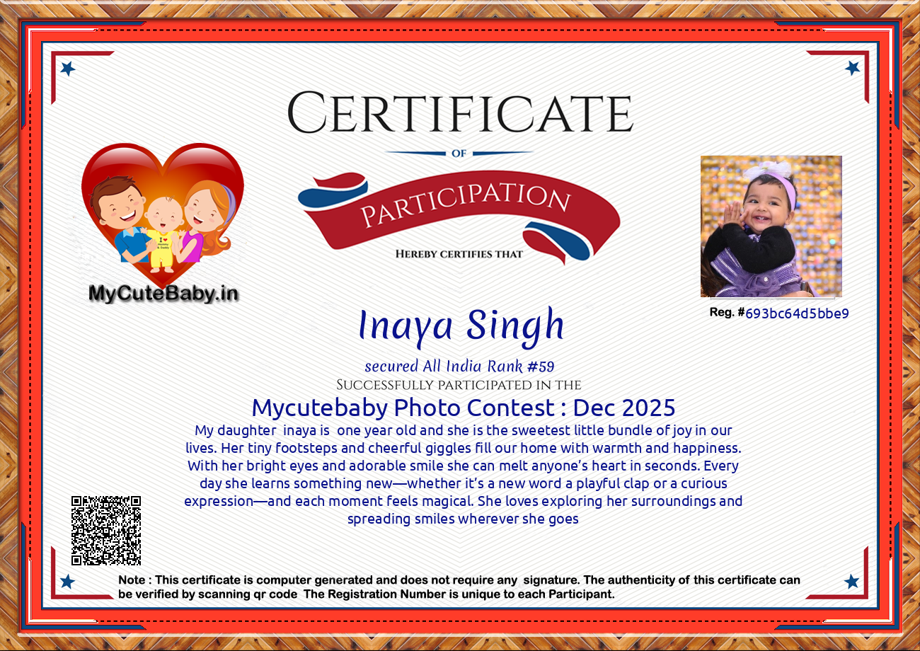 MyCuteBaby is India's most trusted and oldest baby photo contest with best voting securities & transparency system. MyCuteBaby has been organizing monthly contests since February 2017 and has declared 10,900 winners across 109 monthly contests from February 2017 to February 2026 .Enter your baby's photo today for a chance to win and be featured in our gift hamper gallery for the month of March 2026! For detailed prize information, click on the 'Prizes' button to view the prize details of each and every monthly contest.