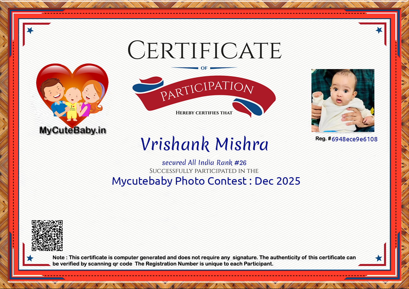 MyCuteBaby is India's most trusted and oldest baby photo contest with best voting securities & transparency system. MyCuteBaby has been organizing monthly contests since February 2017 and has declared 10,900 winners across 109 monthly contests from February 2017 to February 2026 .Enter your baby's photo today for a chance to win and be featured in our gift hamper gallery for the month of March 2026! For detailed prize information, click on the 'Prizes' button to view the prize details of each and every monthly contest.
