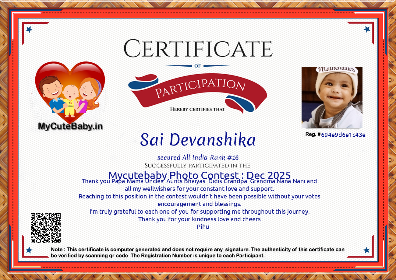 Participation certificate for all the participants whose mycutebaby votes are more than 1000.